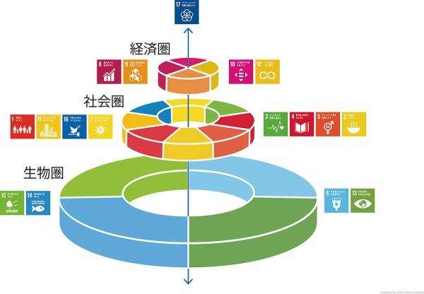 SDGsの理念を用いて地域づくりを考える取り組みは、各地で見られます。ただ、17のゴールと169のターゲットを同時に考え、理解するのは大変な労力がいります。そこで、より少ない分類でとらえる方法があります。もともと持続可能な社会を目指す際に用いられたトリプルボトムラインという考え方です。これは、個人、所属する組織、地域、国の活動や事業などを評価する際に環境・社会・経済的側面の3つの観点から整理するものです。主に、企業活動の評価で活用されることが多かった観点ですが、SDGsの策定に大きく貢献した科学者ヨハン・ロックストローム氏は、SDGsの17のゴールをトリプルボトムラインの3つの層で整理したSDGsウェディングケーキ(図)を提唱しています。3つの層は、生物圏(環境的側面にかかわるゴール)が土台にあり、そのうえに社会圏(社会的側面にかかわるゴール)があり、そこに経済圏(経済的側面にかかわるゴール)が乗っかっており、順番にも意味を持たせています。いずれにせよ、地域づくりには、様々な観点を検討する必要がありますが、環境・社会・経済的側面から考えることは基本となります。