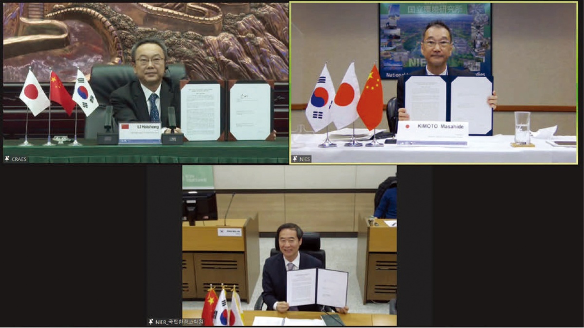 国立環境研究所(NIES)は、韓国の国立環境科学院(NIER)及び中国環境科学研究院(CRAES)と協力して「日韓中三カ国環境研究機関長会合(TPM)」を2004年より毎年開催しており、三機関の新たな協力の姿の議論を行っています。19回目を迎えた本会合は今年もオンライン形式で11月24日(木)に開催され、NIESの木本昌秀理事長、NIERのKIM Dong Jin院長、CRAESの李海生(LI Haisheng)院長が集いました。
