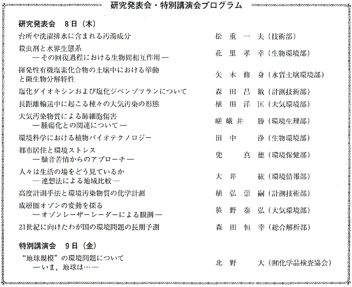 環境週間行事の一環として,恒例の国立公害研究所研究発表会,施設公開が6月8,9日実施された。今年は国公研創立15周年に当たるため,特別企画として北野 大博士((財)化学品検査協会・部長)の特別講演「今,地球は—環境問題と化学の役割—」と映画「風の谷のナウシカ」の上映も行われた。研究発表会,特別講演会のプログラムは下記のとおりである。施設公開としては,環境総合解析情報システム,オゾンレーザーレーダー,水生生物実験棟,騒音実験棟,植物実験棟IIの公開が行われた。