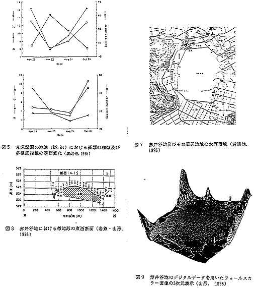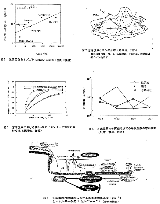 釧路湿原では赤沼周辺の水位観測と植生区分を行った。尾瀬ヶ原の調査は1994年から3年間の第3回総合学術調査の一つのグループとして参加した。赤井谷地の調査は会津若松市の調査指導会議に基づいて1992年から4年間の基礎調査の一環として行われた。宮床湿原は当研究所の特別研究として南郷村との協議の上実施された。宮床湿原を集水域の明らかな人為影響の少ないフィールドとして初期に調査した。遅れて、人為影響の予測される湿原として赤井谷地を調査し、形成タイプや大きさの異なる湿原として釧路湿原や尾瀬ヶ原を調査した。ヨシ中心の釧路湿原と小さな深泥池は面積の割に種数が少なくミズゴケの種の多様性が低いことが解った(図1)。
