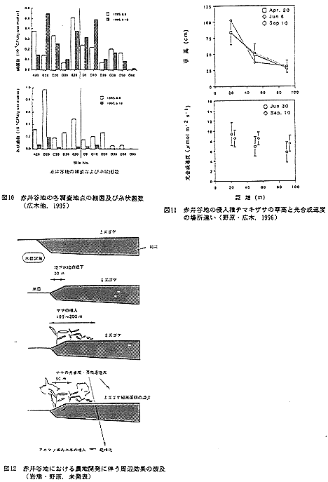 ピット地下水位は周辺の土地利用と水路の有無で影響されることが明らかになった。水位低下によって生じた土壌環境の変化が栄養状態を変え、チマキザサの湿原周辺での生育を盛んにしたと考えられた(図12)。チマキザサやアカマツの記録が1961年の報告に無い事からここ30数年の間に急激に侵入したと考えられた。周縁の切り崩しによって地下水位の低下する範囲や勾配に沿って地下水が流れ込む影響の範囲は湿原に向かって約30mであった。チマキザサの侵入範囲は200m内部まで及び現在の物理環境が及ぶ範囲以上に生物の影響が年数を経て現れている事が解った(岩熊・野原,未発表)。