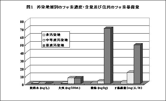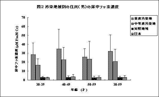 図2に示すように、尿中フッ素濃度は、地域間に顕著な差が存在し、(1)非汚染地の尿中排泄濃度は、日本人のフッ素汚染とほぼ同じ低レベルの汚染である一方、(2)及び(3)の汚染地住民の尿中排泄濃度はフッ素暴露量に比例して増加しており、フッ素症の発生が観察された。