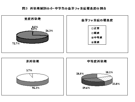 図3に示すように、中国の小・中学生の歯の症状に関しては、(1)非汚染地では96.3%の児童・生徒が正常であり、歯の異常は非常に少ない。(2)の中等度の汚染地では正常な児童・生徒は18.1%にすぎず、軽度、中等度、重度の歯牙フッ素症に関してほぼ同程度の罹患が見られた。さらに(3)の重度の汚染地では正常な児童・生徒は0.5%にすぎず、重度の罹患者は72.7%に及び、フッ素の高濃度汚染が長期間持続していることが明らかとなった。
