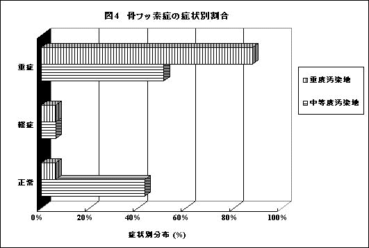 図4に示すように、骨フッ素症の骨X線写真による診断によれば、(3)重度汚染地では受診者の84%に重症の骨フッ素症を認めた。(2)中等度汚染地でも、重症例は51%にのぼる。(3)重度汚染地では骨フッ素症の症状と歯牙フッ素症の罹患度はほとんどの症例で一致したが、(2)中等度汚染地では、骨が重症であるのに歯は変化がないか、あっても軽度の人が少なからずいた。この結果は、中等度汚染地の住民の歯が永久歯に生え替わった以降にフッ素に汚染されたためと考えられるもので、本調査地域では近年石炭の消費量が増加し、それに比例して骨フッ素症も増加しており、早急な対策を必要としている。