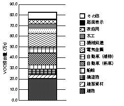 わが国において最大のVOC人為発生源である塗料溶剤の蒸発による排出量について、成分別、地域別推計を試みた。従来の推計例では、塗料製造業による溶剤の種類別使用量を出発点とし、VOCの成分組成は、大気中のVOC濃度実測データを基にしていたが、この方法では、溶剤種類の変更や除去対策などの状況を反映しにくいこと、溶剤組成を正しく表現していないことなどの問題があった。本研究では、推計の出発点を、需要産業別の塗料の生産量とし、塗料の使途を需要産業別、地域別に追跡する考え方を適用し、これに塗料種類別の溶剤含有率、使用量、溶剤の成分組成を組み合せることによって、溶剤使用の実態をよりきめ細かに反映させた。出荷された塗料に含まれる溶剤の量と、塗装時に希釈用および洗浄用に使用される溶剤の量を、塗料の用途ごとに推計した結果、VOCの発生量は90.9万トンと推計された。これらの大部分が大気中に排出されるが、一部は廃溶剤として回収・再生利用されたり、建屋から排出される際に燃焼処理される。その量を差し引いて、大気中への排出量を求めた結果、82.5万トンと推計された。塗料の用途別内訳では建物、自動車、電気・金属などが上位を占めた。(図1:塗装溶剤からの用途別VOC発生量)