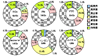 シャシーダイナモ試験(台上試験)等で得られた車種別排出係数に基づいて通常走行時の排気管からのVOC等の排出量推計を行った。本研究では、普通貨物車の重量区分別の走行量や、昼間の走行量と夜間を含む1日の走行量の比(昼夜率)が車種別、道路種別に異なることなどを考慮することによって推計手法の改善を行った。車種別、燃料種別、道路種別の発生量を求めた結果、VOCには、ベンゼンのように主にガソリン車から排出される物質と、ホルムアルデヒドのように、主にディーゼル車から排出される物質があり、後者の車種別寄与率は、NOxやPM(粒子状物質)の車種別排出寄与率と類似のパターンを示した。一方、ガソリン車からの排出が多い物質では、排ガス規制の緩い軽貨物車からの排出が多いことが特徴であった。VOC総量でみた場合も、ガソリン車とディーゼル車、乗用車と貨物車からほぼ同等の寄与がみられたが、これは、軽貨物車などのガソリン車からの排出寄与の大きい物質と、大型のディーゼル車からの排出寄与の大きい物質が含まれるためである。また、道路種別の内訳結果からは、車種別排出寄与を反映して、ホルムアルデヒドでは、PMやNOxと同様、大型車の比率の大きい幹線道路の割合が大きく、ベンゼンでは細街路からの寄与も相対的に大きくなっていた。平成9年度のVOC排出量の推計値は23.4万tとなったが、これは平成6年値の従来推計値25.1万tに比べて7%の減少であった。NOx排出量が26%増であったことを考え合わせると、従来の推計値が貨物車の車重の設定による過小推計であった一方で、この間の新型車への代替によるVOC排出係数の低下がみられたためと考えられる。(図2:物質別車種別の大気汚染排出比率)