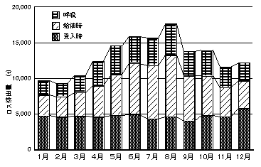 走行時の排気管からの排出だけでなく、蒸発による排出がある。本研究では、駐車中の気温変化に伴う燃料タンクの呼吸による排出(呼吸ロス)、自動車へのガソリン給油時における燃料タンクからの排出(給油時ロス)、ガソリンスタンドにおけるガソリン受入時の地下タンクからの排出(受入時ロス)の3種について、排出量を推計した。ガソリン組成は、本研究において札幌、東京、北九州で夏と冬に採取し、成分分析を行った40種のガソリン組成を元にして、製油所別系列別組成を考慮の上、都道府県別に推定した。給油時ロスを例に、ガソリンからの蒸発量の月別推移を見ると、気温の高い夏季には冬季の2~3倍の排出量となることが分かった。また、比較的蒸発量の少ない成分ほど、季節差が大きい傾向が見られた。(図3:ガソリン蒸発の月変化)