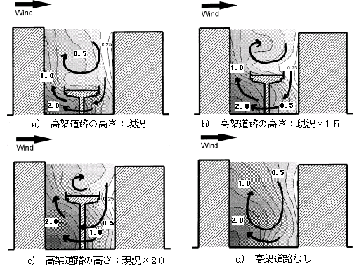 高架道路の有り無しを比べた結果、今回のケーススタデイにおいては、地上濃度分布には大きな差が見られなかった。これは、高架道路が有る場合には道路面に強い渦が出来ず大気汚染物質は弱い逆流によって風上建物下部に運ばれた後、強く攪拌されずに、濃度の高いままストリートキャニオンの隙間の建物端から風下に流出してしまうことによると考えた。(図5:二重構造化したストリートキャニオン内の相対濃度分布)