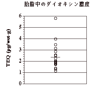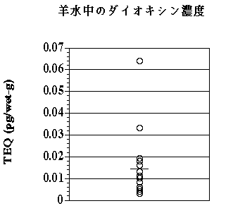 胎児期の曝露を知る目的で、羊水、胎脂中のダイオキシン類濃度を測定した。湿重量あたり平均濃度はそれぞれ、0.016 pg TEQ/wet-g、2.39 pg TEQ/wet-gであった(図1、2)。脂質あたりに換算すると、それぞれ成人の血清、脂肪と同等のレベルであり、胎児はダイオキシン曝露を受けていることが明らかとなった。また、羊水、胎脂の異性体組成は、成人の脂肪組織のそれと異なり、体内に蓄積するダイオキシン類と、体外に排泄されるダイオキシン類の組成が異なることが示されたことは興味深い。