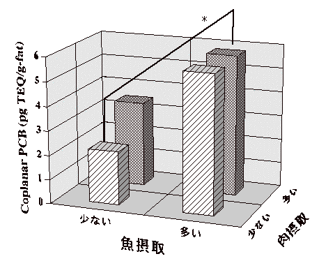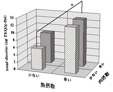 魚・肉共に摂取の多いグループが、共に少ないグループに対して有意に濃度が高かった ( *p < 0.05)
