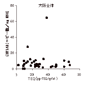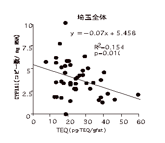 ダイオキシン類の曝露が生体にどのような反応を引き起こしているかを知る目的で、ダイオキシン曝露の鋭敏な生体影響指標と考えられている薬物代謝酵素CYP1A1、CYP1B1の発現をヒト血液サンプルで調べた。まず、リアルタイムPCRによりCYP1A1、CYP1B1の発現を高感度に検出する系を確立した。この方法を用いて、埼玉と大阪の住民の血液サンプルについて、CYP1A1、CYP1B1の発現を測定し、血中ダイオキシン類濃度との関連を検討した。血中ダイオキシン類濃度は、埼玉、大阪でそれぞれ平均25.1、27.8 pg I-TEQ/g-fatで、両地域で差はなかった。CYP1A1の発現と血中ダイオキシン濃度との間に正の相関はみられず、埼玉では弱い負の相関が認められた(図5、6)。このことは、今回測定された血中ダイオキシン濃度は、CYP1A1発現に影響を与えるレベルではないと考えられた。血液中のCYP1A1の発現は、バックグラウンドレベルの曝露の生体影響指標とはなりにくいようである。