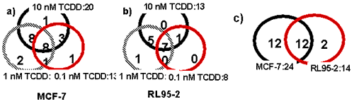 b)RL95-2細胞におけるTCDD濃度と発現変化した遺伝子数。