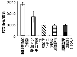 ・硝酸、アンモニア、尿素といった異なる窒素形態を有する肥料の添加効果を比較したところ、無機態窒素(硝酸、アンモニア)よりは有機態窒素(尿素・架橋型尿素)の方が高い石油分解促進効果を有することが示された(図1)。