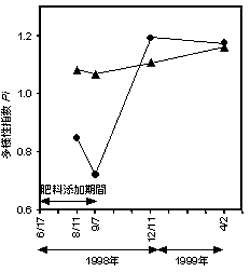 ・土着の微生物群集構造は栄養塩の付与により大きく変化し、多様性は低下したが、時間が経つにつれ復帰し、結果的には栄養塩添加区と非添加区とでは、微生物群集組成は相似したものとなった(図4)。