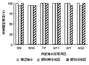 実海域でのバイオレメディエーション実証試験の安全性を評価するために、本研究では培養や飼育が容易である試験海域に生息していた小型甲殻類や、毒性試験としてよく使用されている植物プランクトンを使用した生物影響評価試験を実施した。小型甲殻類としては、当研究所において室内での繁殖法が確立している海洋性小型甲殻類ヨコエビの1種であるフサゲモクズ(Hyale barbicornis)と、植物プランクトンとしては、我が国の周辺海域に広く分布し、かつ代表的な優占種である珪藻(Skeletonema costatum)を用いた。その結果、日本海沿岸部と太平洋沿岸部で実施した石油分解現場試験で得られた海水試料を、上記の試験生物に供試したところ、石油の微生物分解促進のために添加した肥料の添加による悪影響は見られなかった(図5)。