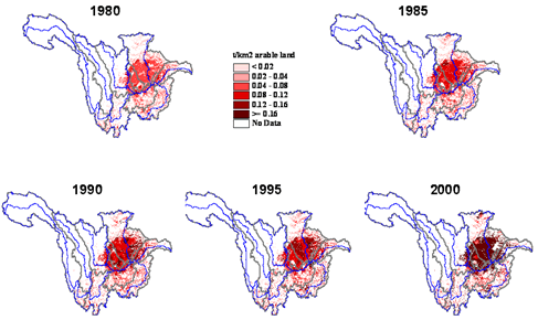 三峡ダム湖の富栄養化が懸念されて現状を考慮して,本研究では農業生態系から三峡ダムに輸送された窒素負荷量の経年変化の検討を行い、長江上流河川および三峡ダムにおける窒素負荷量が急速的に増加していることを明らかにした.長江上流の1980‐2000年の5年毎の農業統計データや気象観測ステーション等の観測データを空間情報システムと結合し,窒素収支に関するデータベースを構築した.これを用いて,長江上流農村地域における人為的活動による反応性窒素(大気沈降,生物固定,化学肥料)や長江上流にある各主支流に輸送された窒素について,量的な及び空間的な変化を解明した.その結果,農業生態系から長江に輸送された窒素の量は総量の約9割を占め,1980年か2000年までに2.8倍に増加した.河川中の損失率が36%と仮定して,長江上流農村生態系から三峡ダムに輸送されたNの総量を計算した結果が図-2であり,河川への窒素輸送総量のうち,人為活動による河川に輸送される窒素の量は1980年から2000年までに4倍以上に増加したことを示している.一方,農村人口の排泄物による河川へ直接輸送された窒素の量は1980-1990年間増加し,1990-2000年減少していた.窒素源は,1980年には主に成都市と重慶市の周辺農村地域に集中していたが,1990年代に四川盆地の全範囲,及び四川盆地周辺の丘陵地に広く拡大し.化学肥料使用量の急増及び効率の減少が長江上流の窒素負荷量を増加させ、水質を悪化させる主な要因であったと推測された.