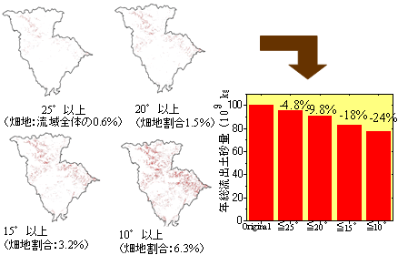 長江上流域の主要支流域である嘉陵江流域を対象に,流域水文モデルを用いた水・土砂流出計算の実施とその検証を行った後,急傾斜地にある畑作地を森林域へ還元した場合の,雨水及び土砂流出抑制効果の検討を行った.近年頻発する長江流域における洪水災害の要因の一つに,上流域の森林面積の減少とそれに伴う土砂流出の増大が挙げられる.長江上流域にある四川省での植生被覆率は1949年の20%が,1980年には12%,現在では4%にまで低下している.また,2009年に完成予定の三峡ダムへの膨大な量の土砂流入は,その主な役割の一つである洪水調節に対して悪影響を及ぼすことが懸念される.これに対し中国政府は,雨水および土砂流出の抑制を目的として,流域内の急傾斜地に開発された耕地を森林や草地に戻す退耕環林政策を開始したが,洪水抑制や土砂流出量の低減に関する定量的な効果は確認されていない.本調査の結果,中国政府が推奨する傾斜角25度以上の畑地を森林地に戻す方針の効果が,図-3に示すように還林の閾値を変化させることで,より分かり易くなった.