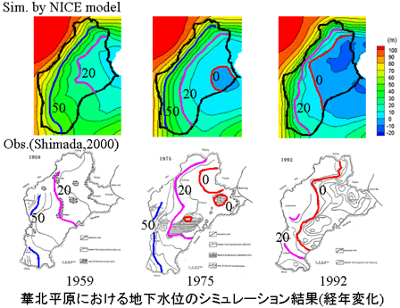 統合型流域モデル(NICEモデル)に農業生産モデルを結合することによって,華北平原及び黄河下流域での潅漑が地下水流動に及ぼす影響についてシミュレーション(NICE-AGRモデル)を行い、過度な灌漑によって地下水位及び水収支が大きく影響を受けていることを明らかにした.本モデルはトウモロコシ及び小麦の生育に必要な潅漑量を従来の統計データ・文献データよりも精度良く再現し,両作物の栽培時期における土壌水分,LAI,蒸発散,作物生産量,地下水位を良好に再現した.シミュレーションによって華北平原における空間的な地下水位分布(図-4)が得られた。