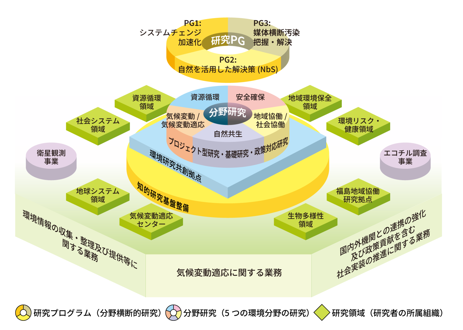 国環研では、第6期中長期計画(2026~2030年度)に基づき、国内外機関との連携のもとで、環境研究の柱となる4分野(気候変動・適応、資源循環、自然共生、安全確保)に、地域社会の関係主体と協働してより統合的・実践的な取組を推進する1分野(地域協働/社会協働)を加えた5つの分野において、創造的・先端的な科学の探究を基礎とする研究から実践的研究、社会実装に関わる事業的取組に至るまで幅広い段階を含む取組を体系的に実施しています。また、3つの統合型研究プログラム(システムチェンジ加速化研究PG、自然を活用した解決策(NbS)PG、媒体横断汚染把握・解決PG)において、研究分野を横断して重点的に取り組むべき課題への分野横断的かつ統合的な観点での研究を推進しています。これらに加えて、中長期的な視点でのモニタリングやデータベース・情報整備等の知的研究基盤に関する取組のほか、GOSATシリーズによる温室効果ガス等のモニタリングや子どもの健康と環境に関する全国調査(エコチル調査)といった国の計画に基づき中長期計画期間を超えて実施する大型事業の着実な推進にも取り組んでいます。