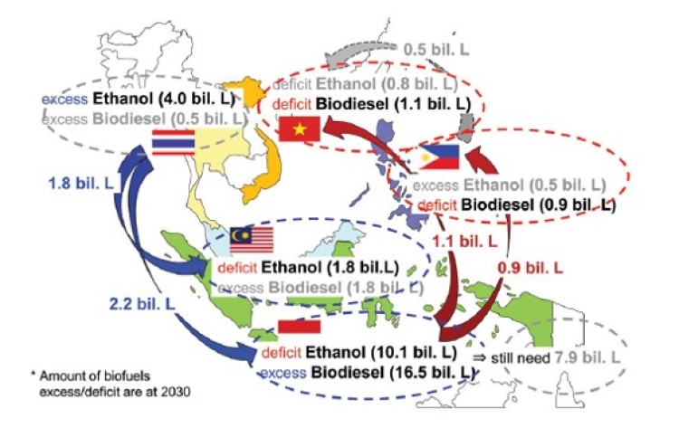 The objective of this study is to investigate potential diversified transportation energy source solutions and their effective use up to 2030 in order to establish sustainable energy use in road transportation. Five Association of Southeast Asian Nations (ASEAN) countries (Thailand, Indonesia, Malaysia, Philippines, and Vietnam) are examined by considering their economy, energy status, and automotive market scale. In this study, existing energy policies, fuel supply, demand status, petroleum and alternative fuel products, such as natural gas and biofuels, and oil refining/biofuels production capacity are investigated as components of energy mixing. If there are gaps between oil reduction targets and Business as Usual (BAU) consumption, or the required amount of biofuel use to achieve introduction target and possible supply, measures such as improved new vehicle fuel economy, adjustment of biofuel utilization, and natural gas utilization are considered to minimize gaps or to meet policy targets. An appropriate and cost-effective combination of measures is proposed as an alternative case for each country’s needs. Results show that biofuel utilization is one of the measures that is crucial in meeting policy targets. Even in the alternative case, however, estimated demand volume of biofuel exceeds domestic supply volume in some countries, while estimated demand volume of biofuel is lower than domestic supply volume in other countries. In order to solve these gaps and cultivate biofuel security within the ASEAN region, a concept of multi-national cooperation of biofuel is proposed. Creating policies to diminish barriers that prevent the trade of biofuels between neighboring countries is the key to success.