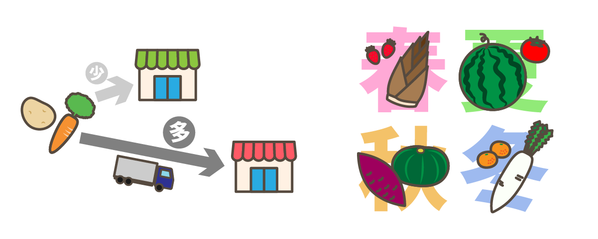 消費地点まで食品を運ぶ際、運送により燃料が消費されるので、生産地が近ければ近いほど温室効果ガスの排出量が少なくなります。また、旬ではない農産物を育てるには追加のエネルギーがかかる(農産物の生育環境を、夏は冷やしたり冬は温めたりする)ので、旬の食材を選ぶことによって、電気や燃料の利用が減り温室効果ガスの排出も減ります。