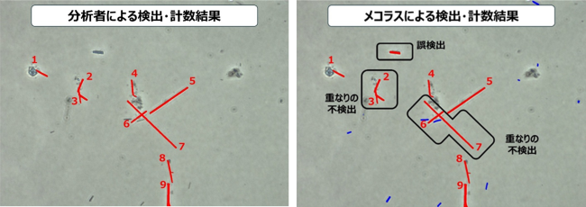 図1に精度の評価例を示しました。2本の繊維が重なった集合体が2つ(番号2・3および6・7)ありますが、検出精度ではこれらを個別に識別せず1つとして扱います。この例では7つの繊維集合体すべてを検出しているため再現率は1.0となり、メコラスが検出した8個体のうち1個体が誤検出であるため適合率は 0.88 になります。計数精度では重なった繊維も個体識別し、4本としてカウントします。計数対象繊維9本のうち、メコラスは重なりを識別できず7本と計数したため再現率は 0.78 となり、検出した8本のうち1本が誤検出であったため適合率は 0.88 になります。